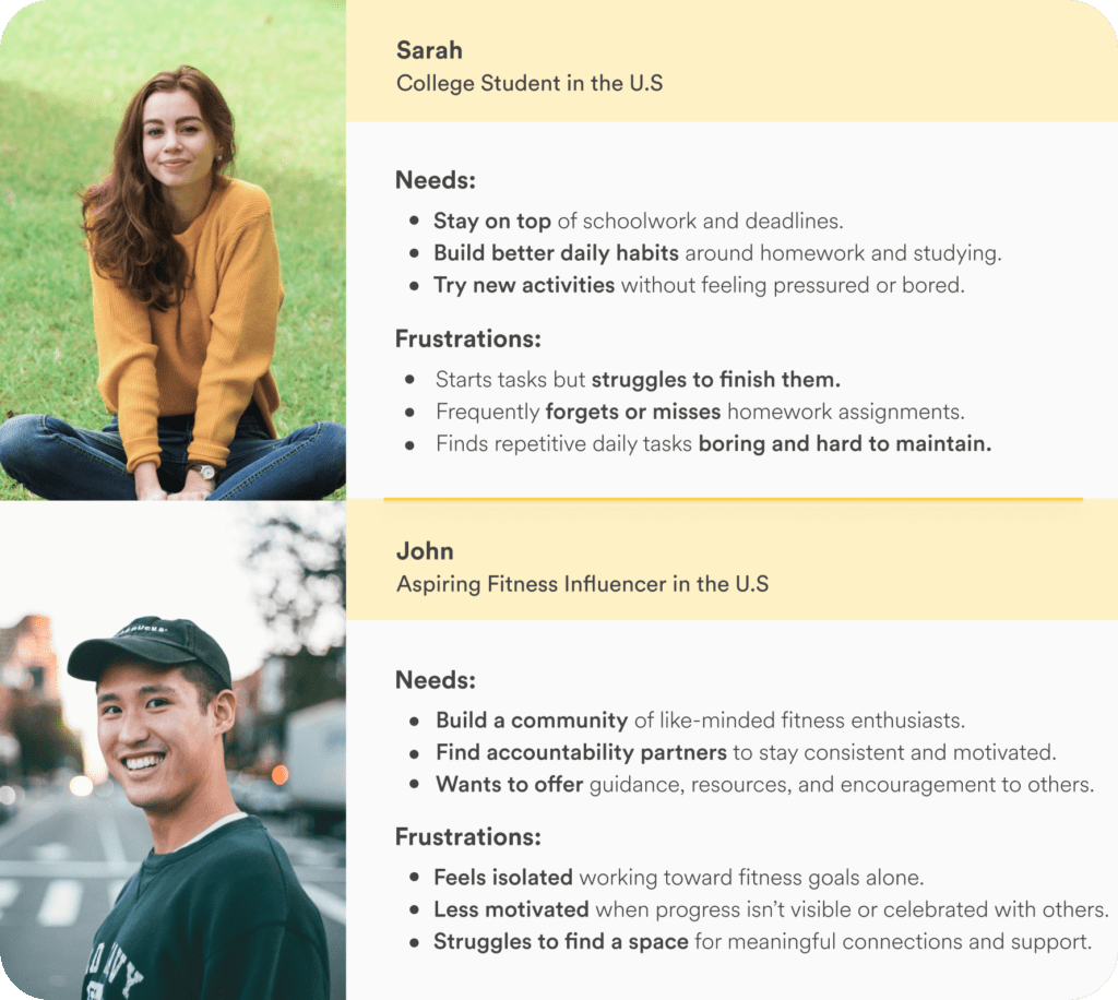 Together with my team, we analyzed the research data to better define our users’ needs. We discovered that 60% of users reported struggling with motivation when completing tasks, while others felt uncertain about starting a new habit because they didn’t know where to begin.