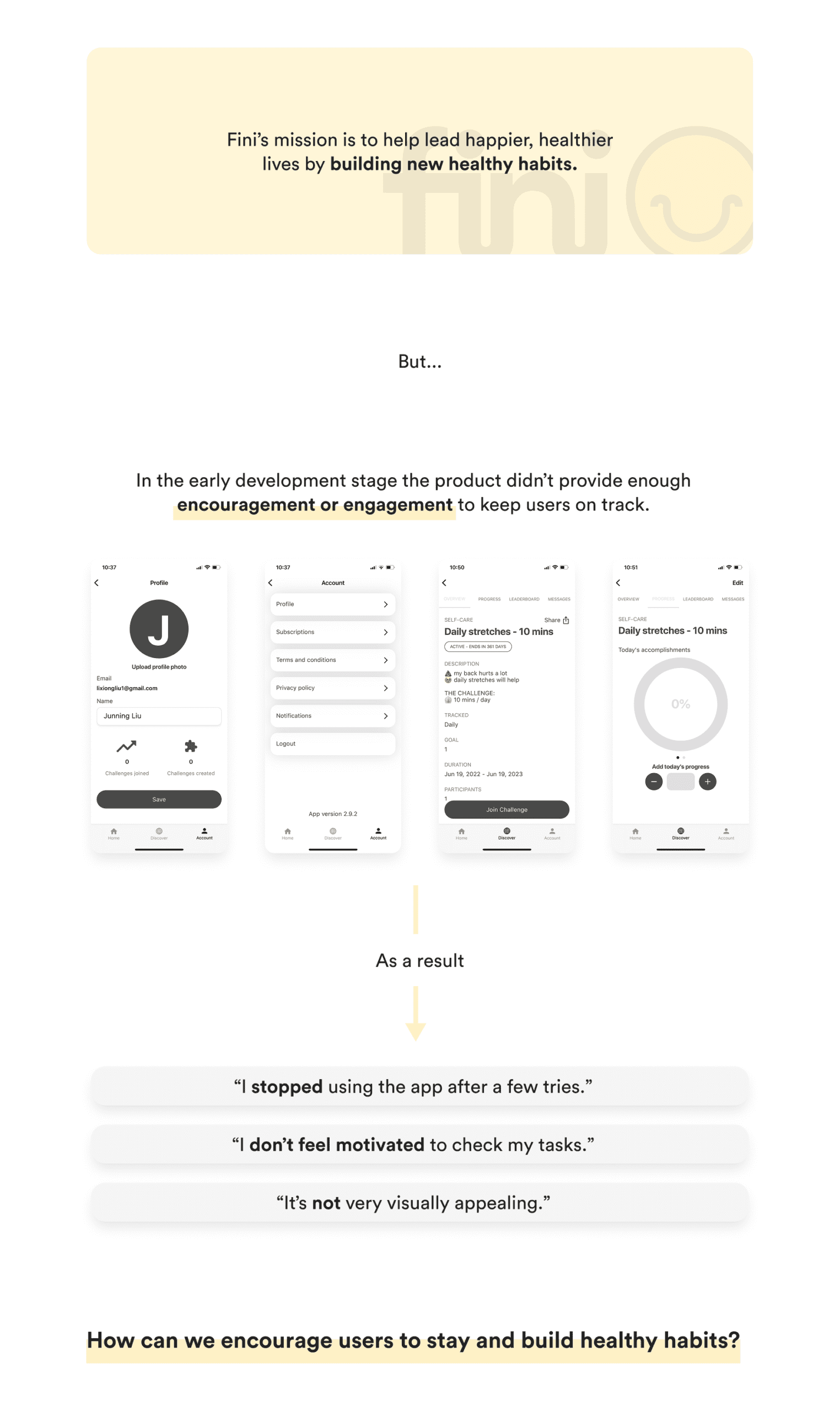 We designed Fini, a goal-tracking app that helps users stay motivated and consistent in achieving their personal goals. Fini combines progress tracking, gamification features, and an accountability partner system to make goal completion more engaging and rewarding. The app also fosters a sense of community by connecting users with mentors and peers, allowing them to share progress, support one another, and grow together through shared challenges.